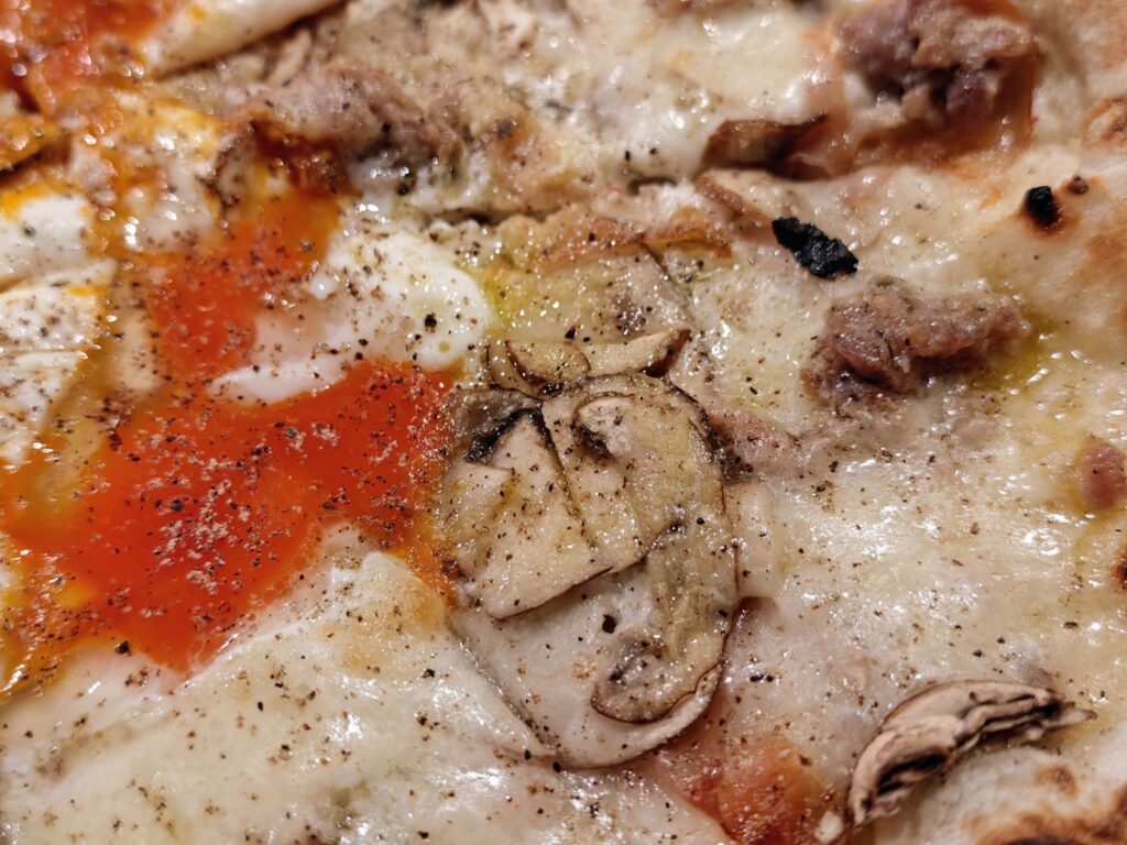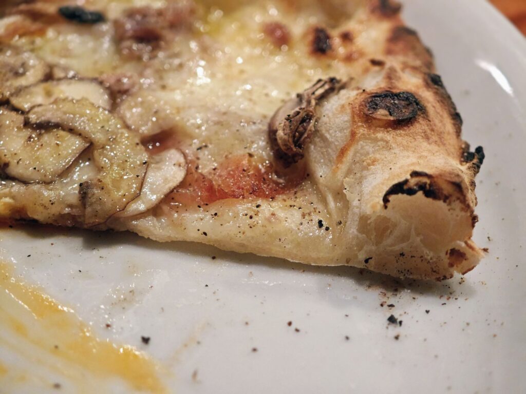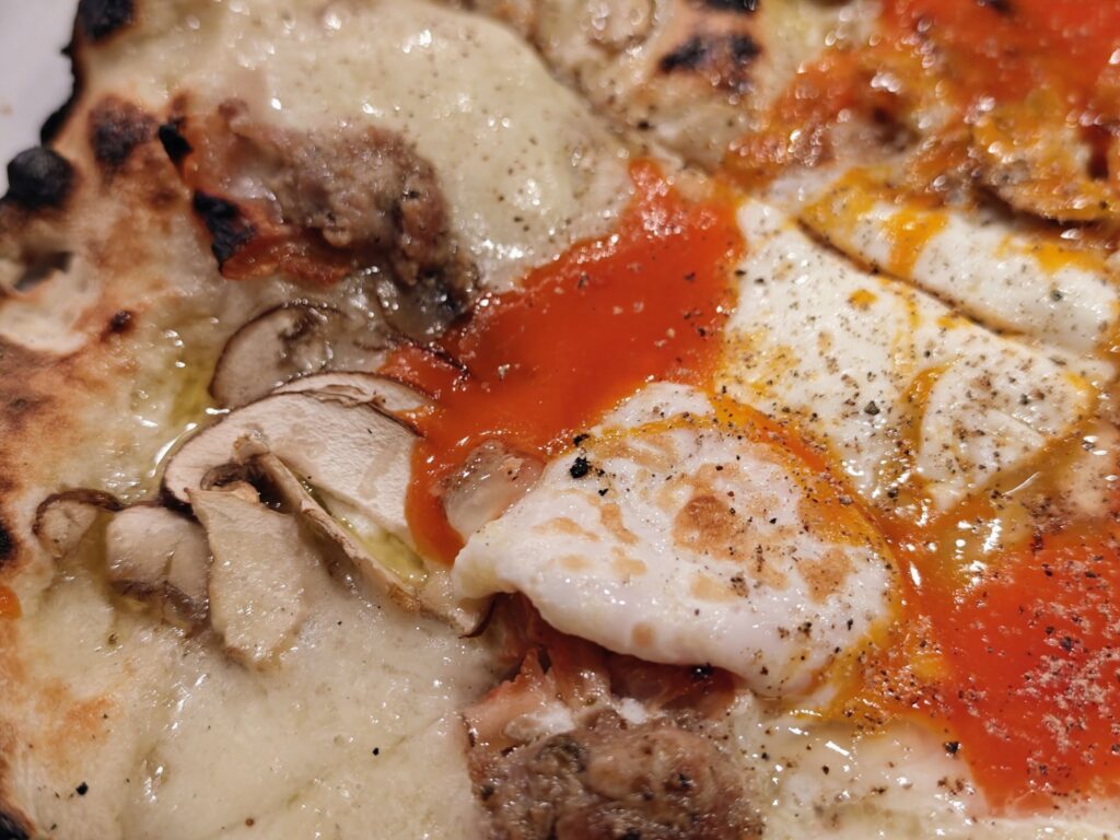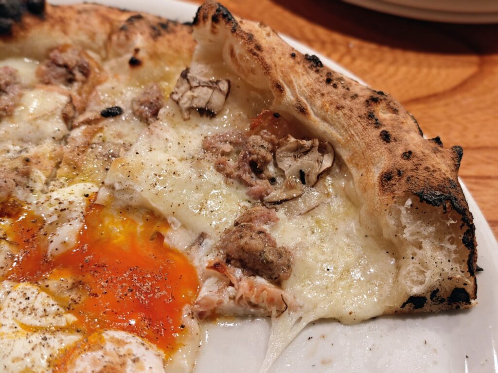 チーズ主体のビアンカ(白)のピッツァに半熟卵のねっとり濃厚な卵黄が絡んで美味。総評するとマッシュルーム・肉・チーズ・半熟卵とまさに店のフラッグシップメニューにふさわしい「全部盛り」のゴージャスなピッツァでした。