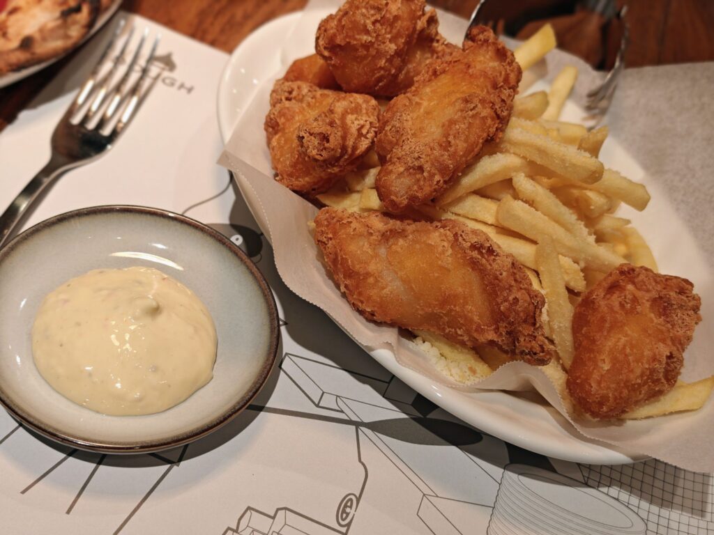 白身魚のフライはザクザクとしたクリスピーで肉厚な衣にホクホクとした魚の食感。フレンチフライは藻塩の乗りがよく美味しくいただけました。