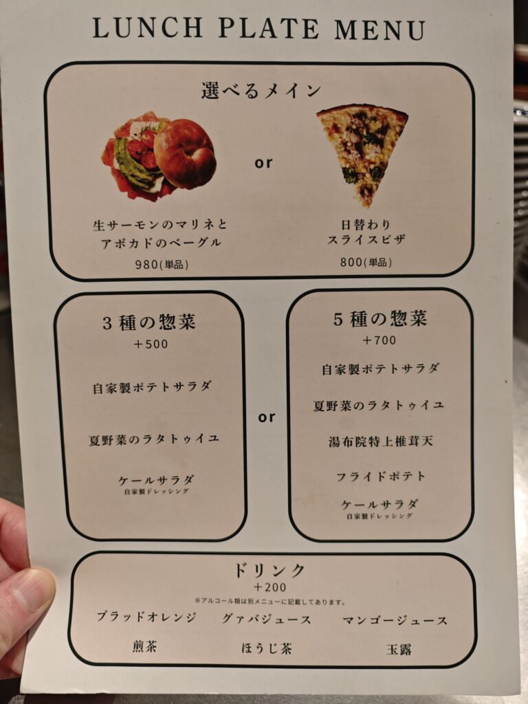 ランチプレートはベーグルとピザの2種。基本のプレートにオプションで「3種の総菜」、「5種の総菜」、ドリンク類をつけるシステムでした。