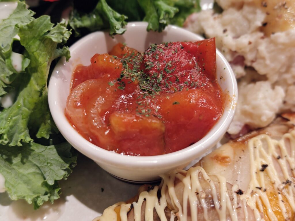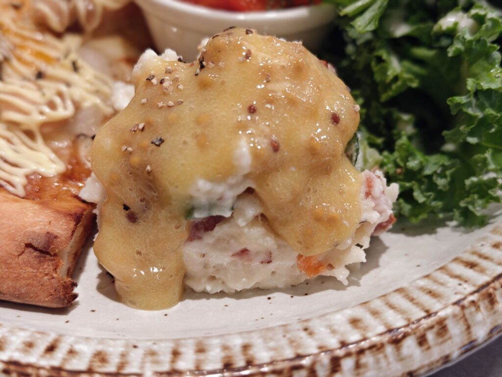 ねっとりとしたサワー感のあるドレッシングがかかっています。ジャガイモとマヨの濃さもありますが小さく刻んだベーコンがたっぷり入っており、挽き立ての胡椒のピリリ感も相まってパンチある味わいに仕上がっています。