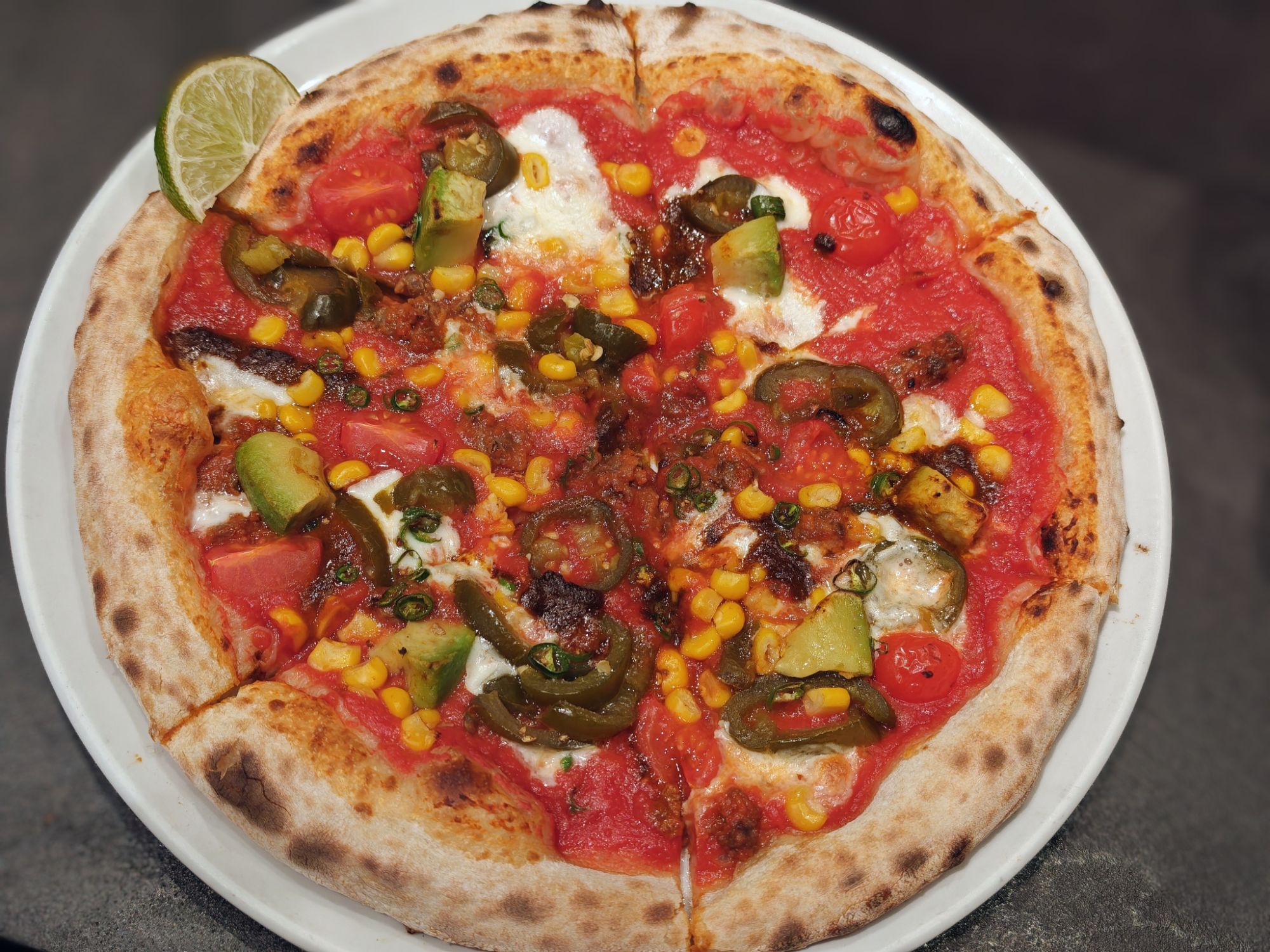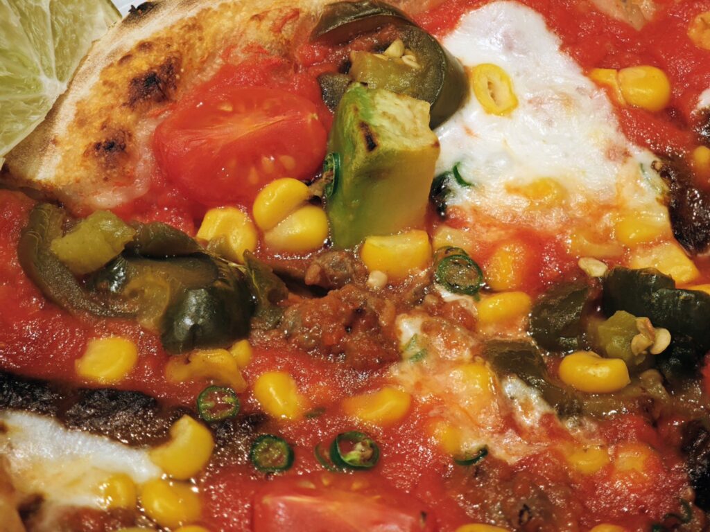 お好みでライムを絞ってピッツァにかけると、柑橘類特有の爽やかさと苦味成分で辛味が幾分か中和されます。メキシコらしい具材をふんだんに使った珍しいピッツァを食べる事ができました。