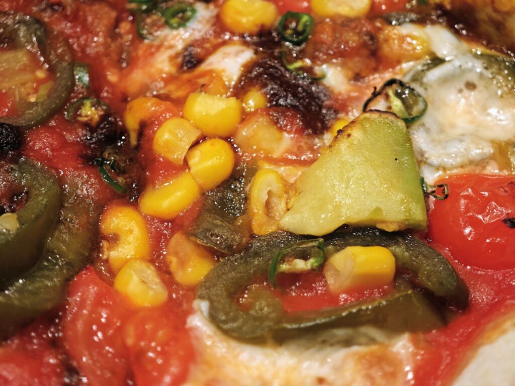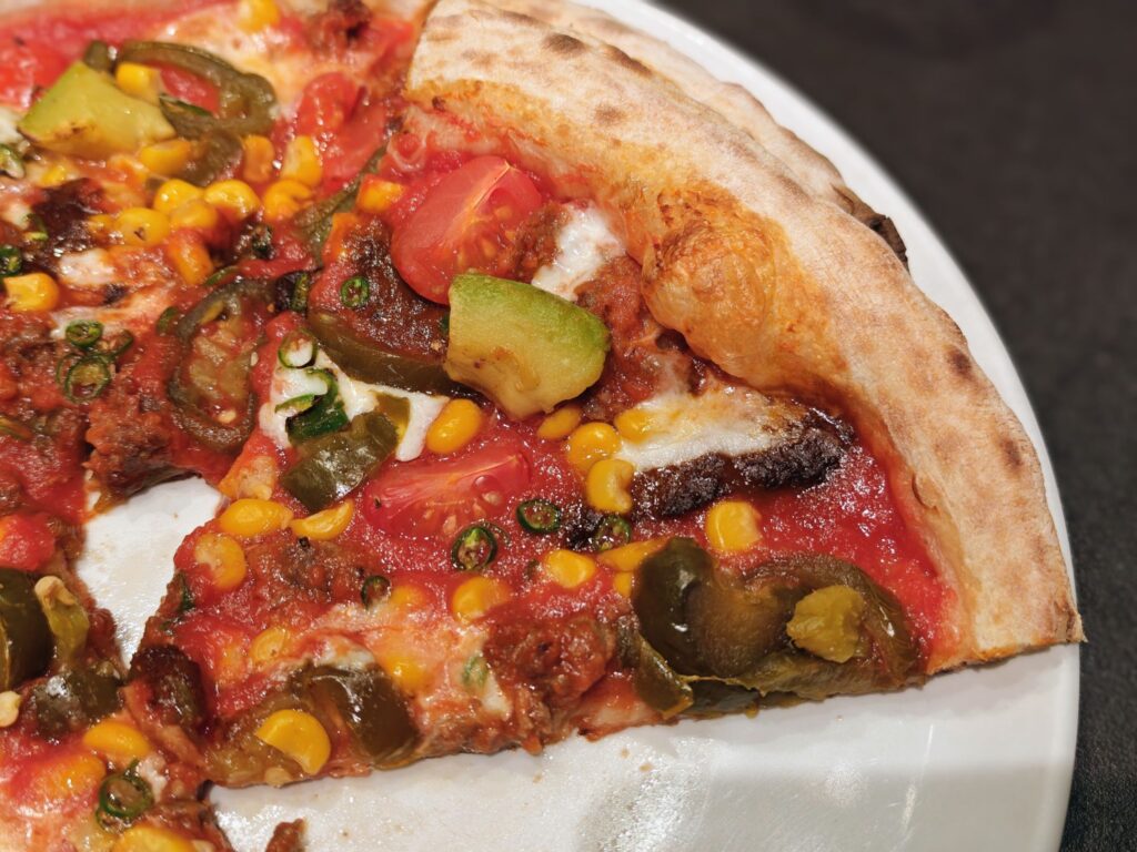 ピリッと辛いのですが乾燥唐辛子のようなストレートな辛さではなく、ベクトルは青唐辛子やハラペーニョの酸味感を伴う「酸っぱ辛い」方向性です。この「酸っぱ辛さ」がモッツァレラやグラナパダーノのチーズのマッタリ感を上書きしている感じ。