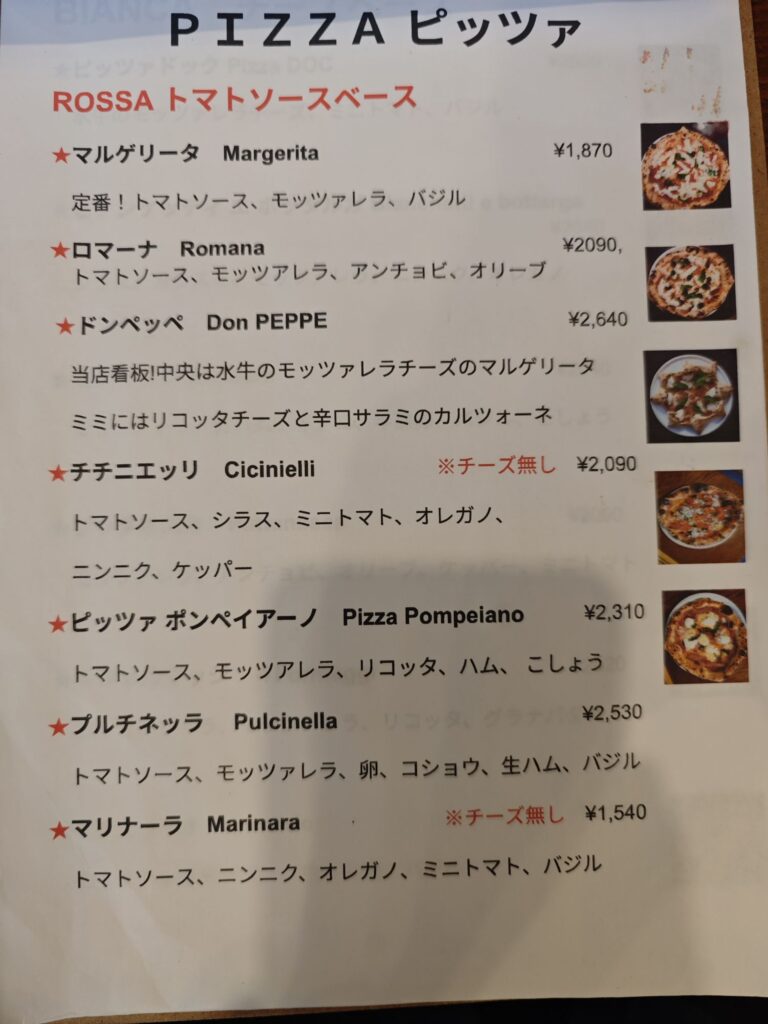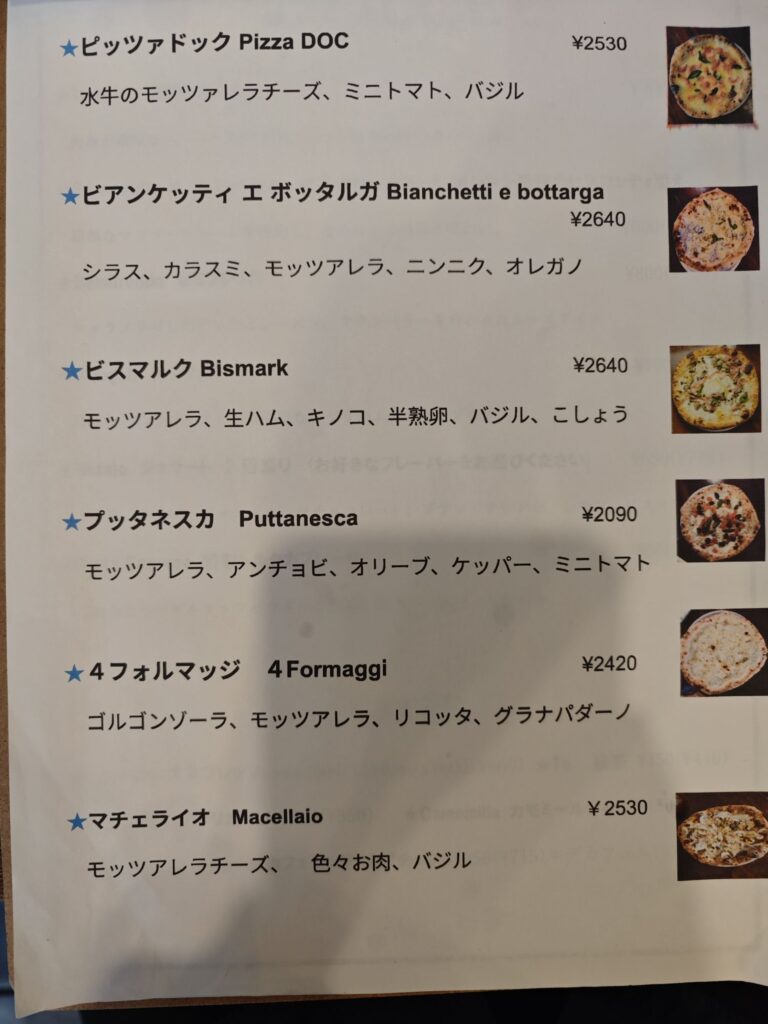 メニュー表を眺めていると王道のマルゲリータやマリナーラはもちろん、師匠である『ナポリスタカ』の代名詞である星型ピッツァ「ドンペッペ」あり。