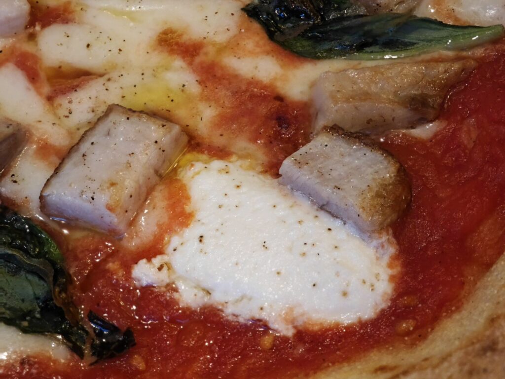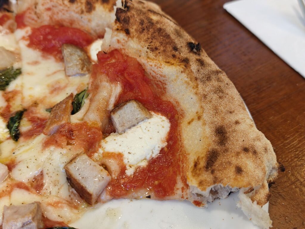 幅広なコルニチョーネ(縁)にさっくりとクリスピー寄りに焼き上げた生地。モチモチ感よりもパリサク感に重きが置かれており、咀嚼しても塩味(えんみ)の尖りが少なく優しい味わいだ。