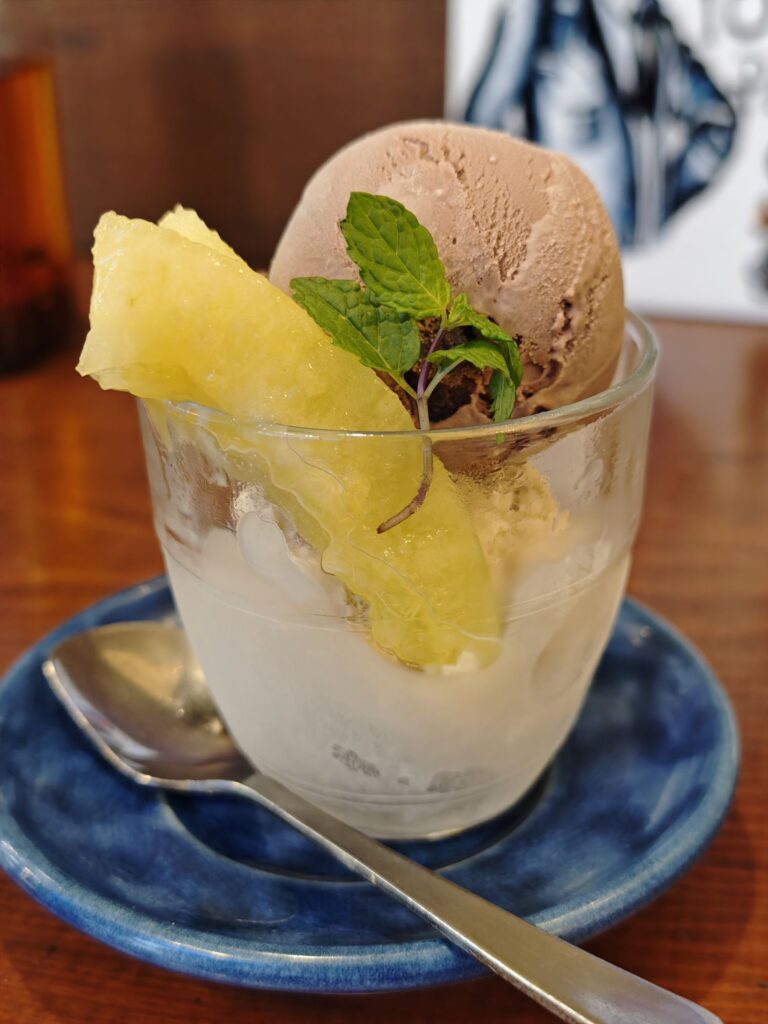 ジェラートはバニラ、イチゴ、ジャンドゥーヤチョコレート、ブラッドオレンジ、レモン、ピスタチオから好きな2種を組み合わせる事ができる。ミントの葉とカットしたメロンが添えられていた。