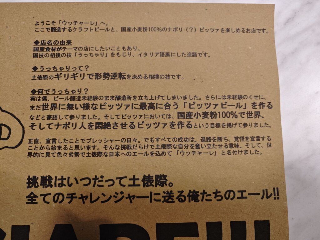 店の名前は相撲の技「うっちゃり」から来ているらしい。思えば『バッカムニカ』の店名も「バカになれ!」をイタリア語風に文字ってましたね、この系列はネーミングセンスがユニークだ(笑)