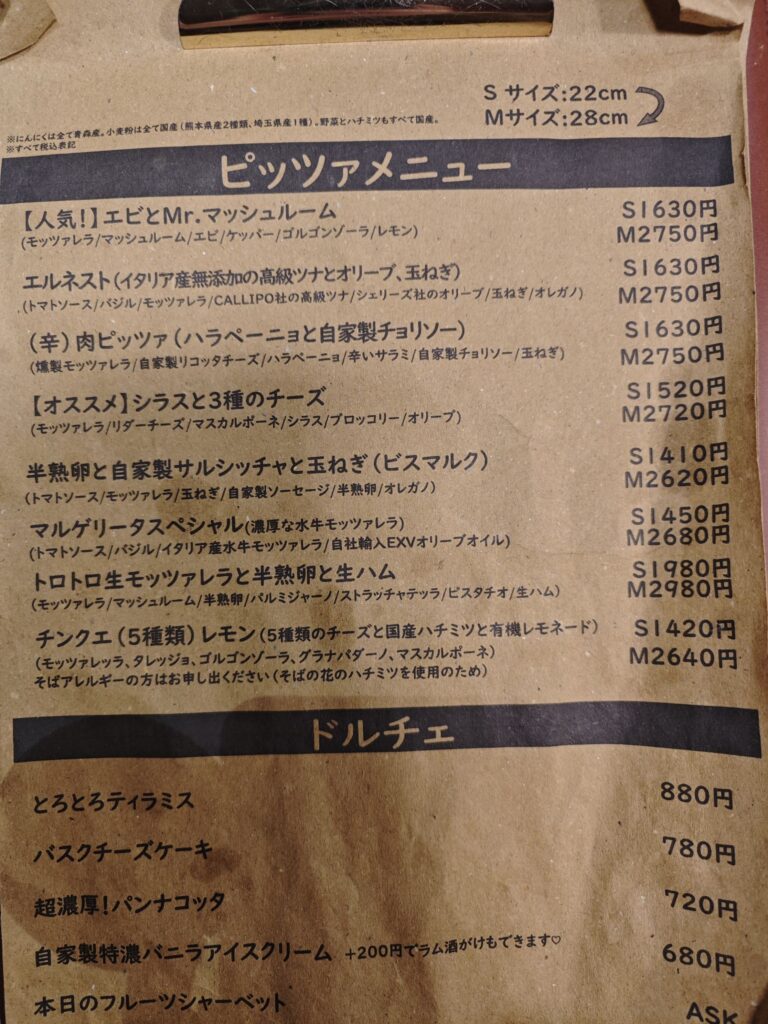 ピッツァは直系22cmのSサイズと直径28cmのMサイズあり。この辺りは鮫洲の『ピッツェリア バッカムニカ』と同じですね。