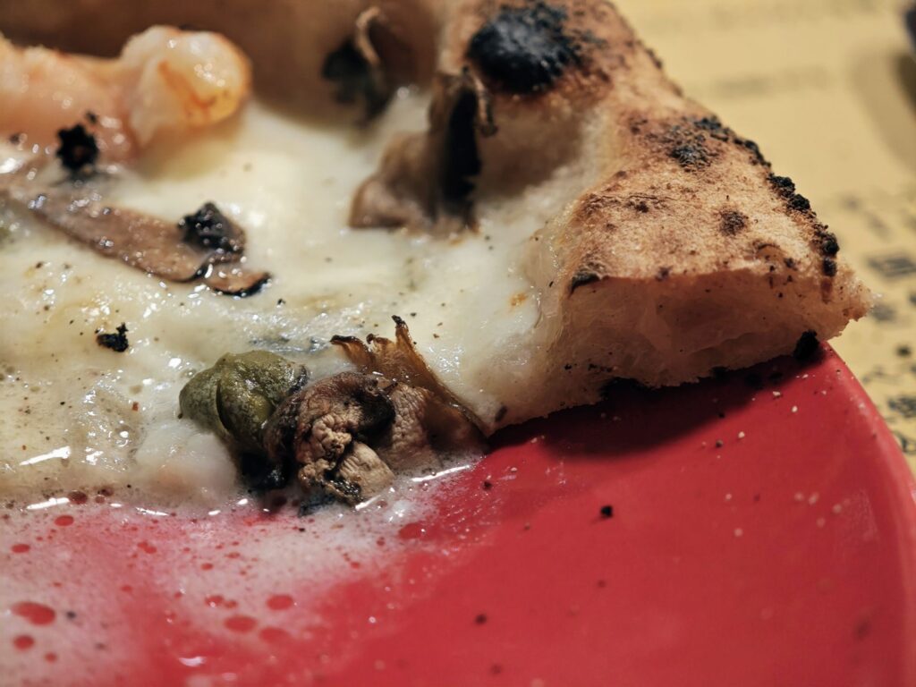 食べてみると表面のサクッとした歯ざわりを最初に感じ、次にもっちりとしたグルテン質な粘りを一瞬あり最後は綺麗に歯切れしてくれる感じ。小さいながらコルニチョーネ(縁の部分)はしっかりと厚みを持たせてあり力強い食べ心地が特徴的だ。