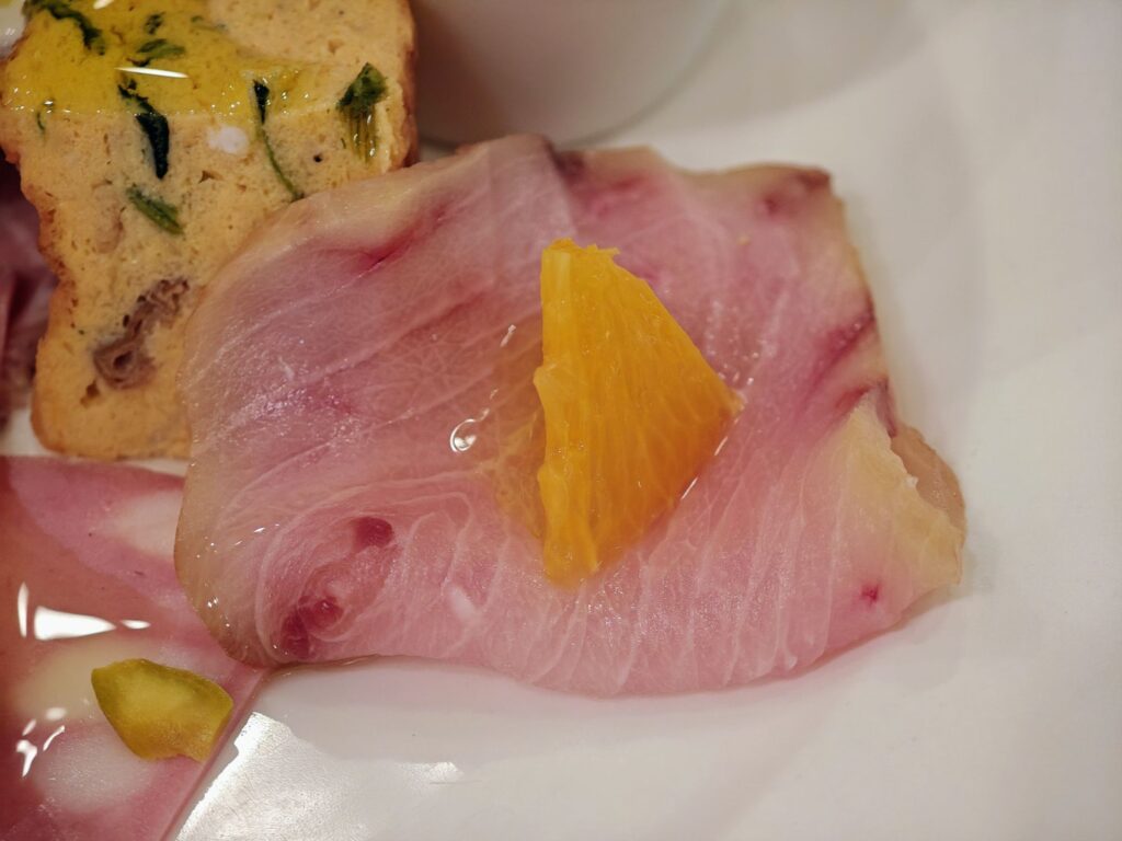 「メカジキのカルパッチョ」。白身魚のような淡泊でこざっぱりした後味とブリッとした弾力感に富んだ食感。