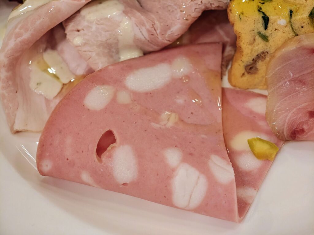 まず「モルタデッラ」。優しいマイルドな塩味(えんみ)感と脂肪分の甘さが引き立つ。