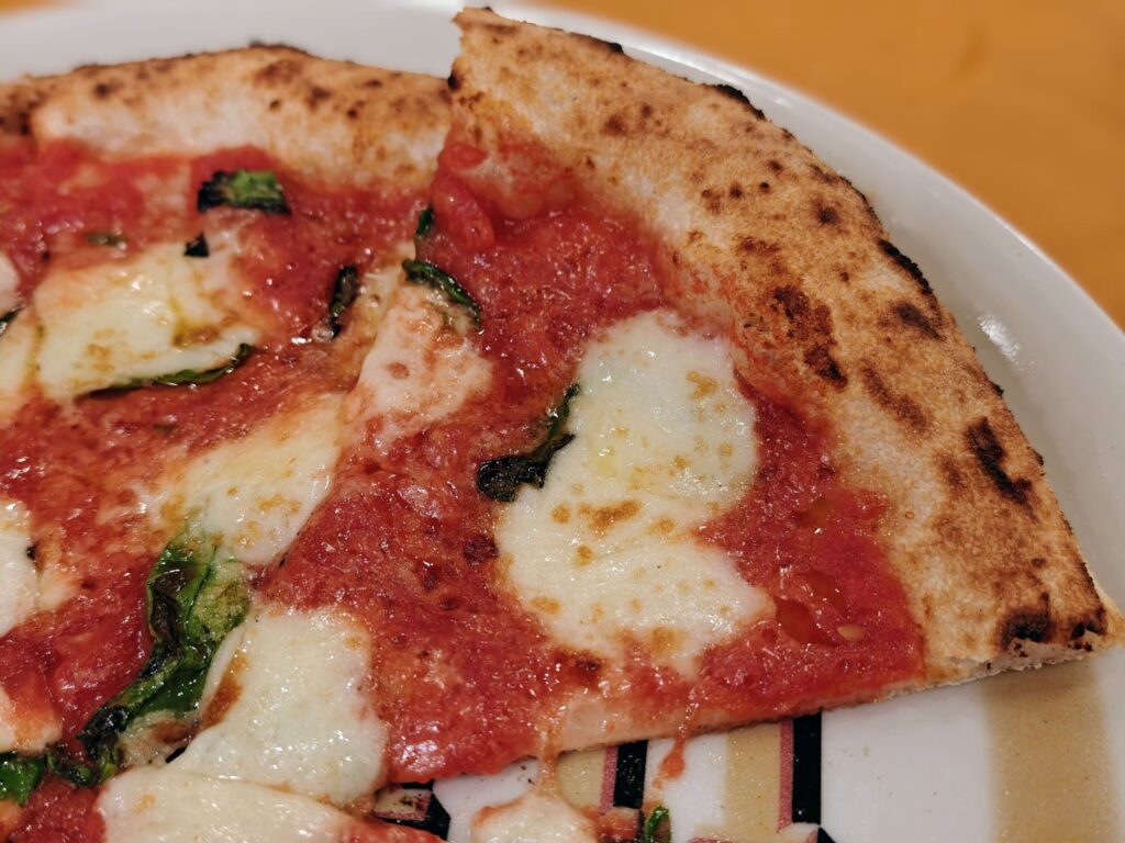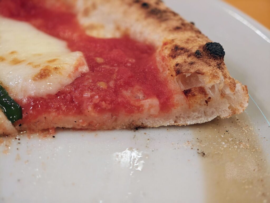 噛むとバリッザクッとしててややハード目な生地の仕上がりだ。本場のナポリピッツァの生地は小麦粉・塩・水・酵母の4種の材料のみから作られますが、イルサッジオさんの生地は生地の中に塩気をあまり感じさせずその分、小麦のピュアな甘味が前面に出ているように感じます。