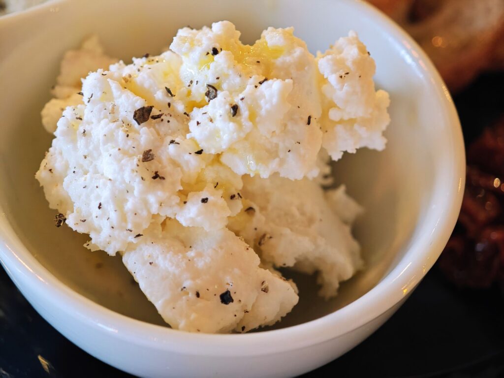 リコッタのフレッシュチーズ。熟成させたチーズと異なるさっぱりとした味わいと刺身のような瑞々しさとミルキーな風味。