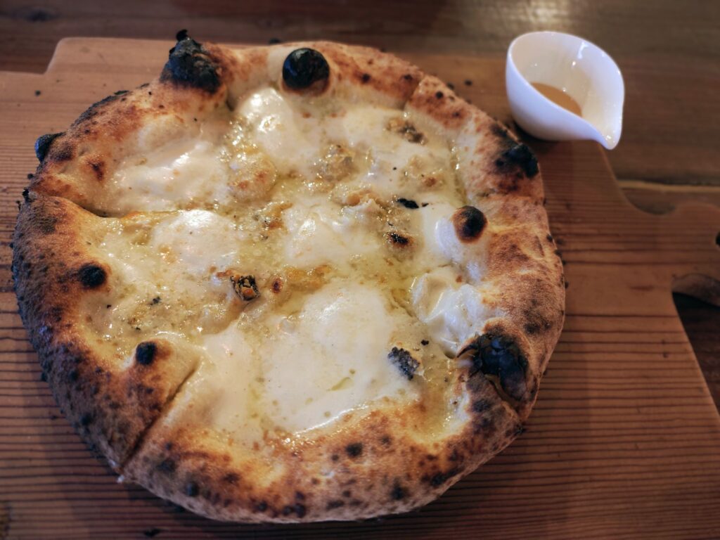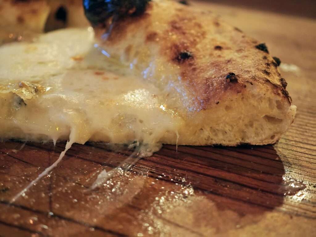 モッツァレラのミルキーなコク、ブルーチーズの独特のクセ感と香り、カマンベールのリッチで濃厚な風味、グラナパダーノのパサッとした舌ざわりと塩味と甘味、4種のチーズそれぞれがキャラ立ちしてて感じられるのが凄い。